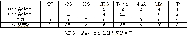 1월 25일 방송 총선 보도량은 KBS 2건, MBC 2.5건, SBS 2건, JTBC 6건, TV조선 8.5건, 채널A 6건, MBN 10건, YTN 3건이다. 이날 천정배 의원의 국민회의가 국민의당과 통합에 합의했고 더민주는 정의당과 범야권 전략협의체를 구성했다. 새누리당과 관련해서는 △인재영입 놓고 계파 갈등 △정의화 의장 국회선진화법 직권 상정 거부 및 불출마 선언 △계파간 공천 갈등 등의 사안이 있었다. 통합, 연대 등 굵직한 이슈가 많은 야당 관련 보도량이 전반적으로 많았다.