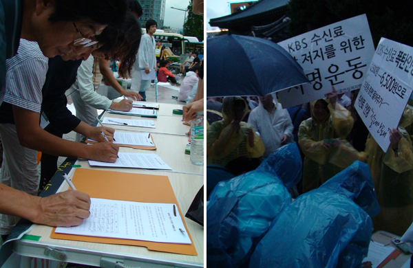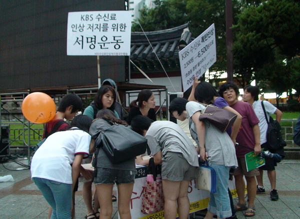 KBS수신료인상저지범국민행동은 지난 11일 서울 보신각에서 열린 4대강 생명살림 문화제에 참석, 문화제 식전에 수신료 인상 반대 캠페인을 진행했습니다.