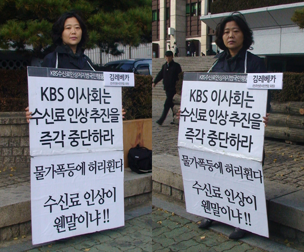 KBS수신료인상저지범국민행동(범국민행동)은 11월 12일 12시부터 13시까지 KBS 본사 앞에서 "KBS 이사회는 수신료 인상 추진을 즉각 중단하라. 물가폭등에 허리휜다, 수신료 인상이 웬말이냐!"는 내용으로 1인시위를 진행했습니다.