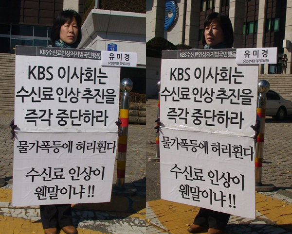 KBS수신료인상저지범국민행동(범국민행동)은 11월 15일 12시부터 13시까지 KBS 본사 앞에서 "KBS 이사회는 수신료 인상 추진을 즉각 중단하라. 물가폭등에 허리휜다, 수신료 인상이 웬말이냐!"는 내용으로 1인시위를 진행했습니다.