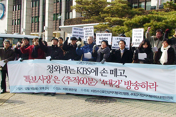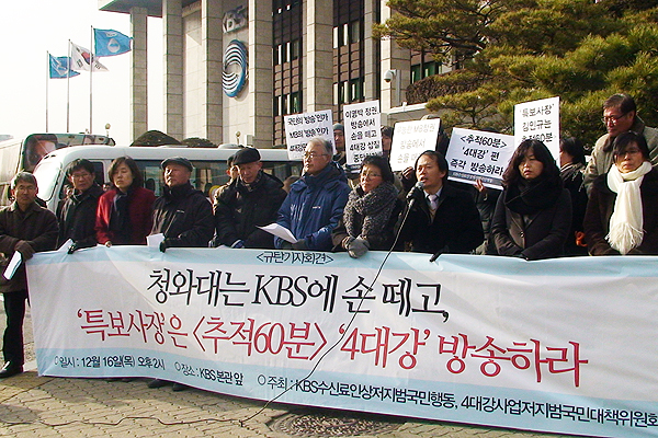 KBS수신료인상저지범국민행동과 4대강사업저지범국민대책위원회는 청와대의 외압을 규탄하고 <추적60분> ‘4대강’ 편 방송을 촉구하는 기자회견을 12월 16일 오후 2시 KBS 본관 앞에서 열었습니다. |
