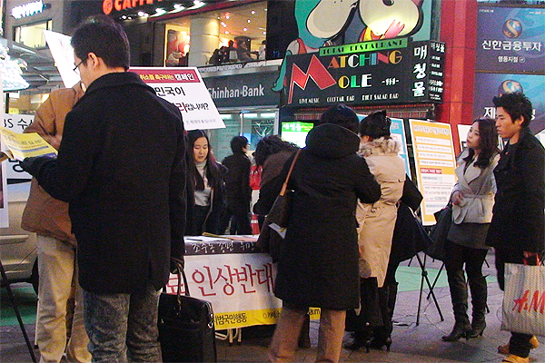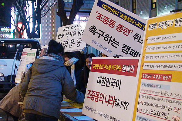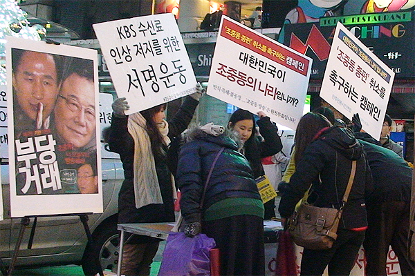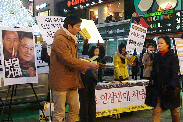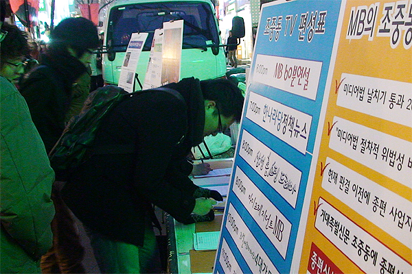 우리단체는 1월 19일 명동예술극장앞에서 5시부터 8시까지 '조중동 종편' 취소를 촉구하는 캠페인을 벌였습니다. 아울러 KBS수신료 인상반대 서명전도 함께 진행했습니다.