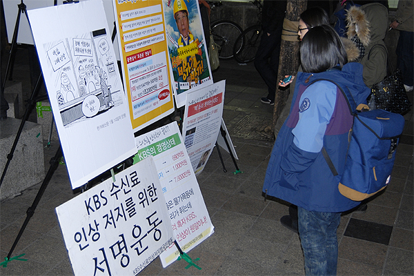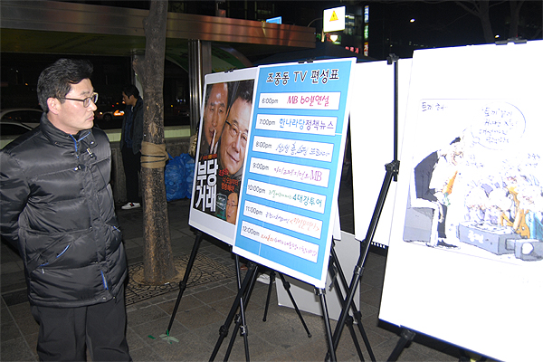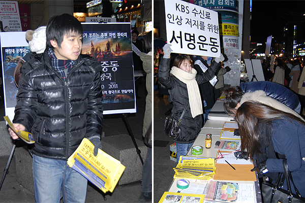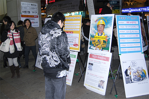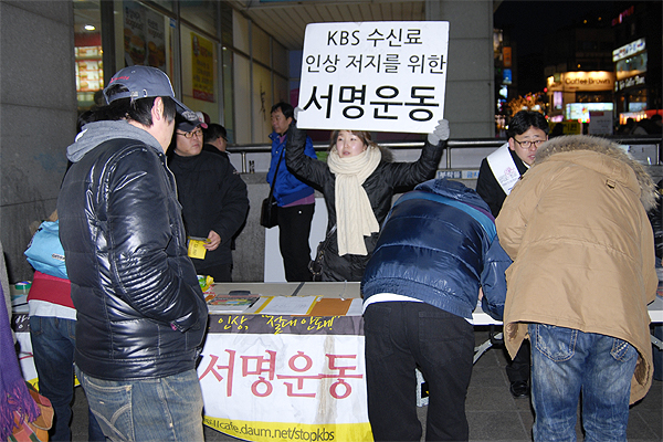 우리단체는 1월 22일 홍대입구역 9번출구 앞에서 5시부터 8시까지 '조중동 종편' 취소를 촉구하는 캠페인을 벌였습니다. 아울러 KBS수신료 인상반대 서명전도 함께 진행했습니다.