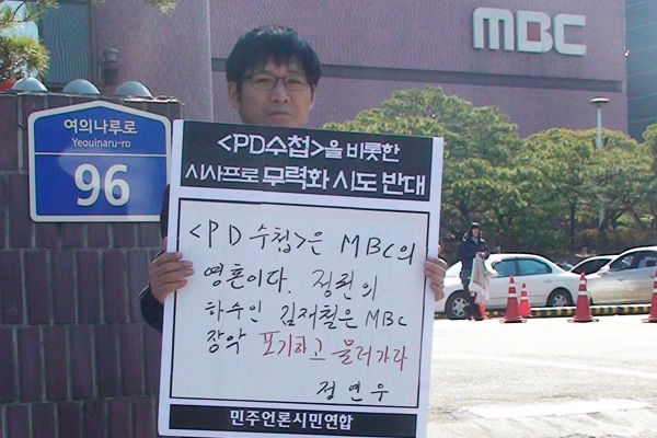 3월 11일 정연우 상임대표는 MBC의 < PD수첩>을 비롯한 시사프로그램 무력화 시도를 반대하는 1인 시위를 벌였습니다.
