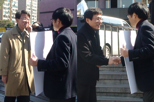 1인 시위 중 정호식 PD(전 MBC 시사교양국 국장)와 김환균 PD(전 <PD수첩> 책임프로듀서)를 만나 인사를 나눴습니다.