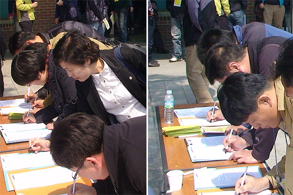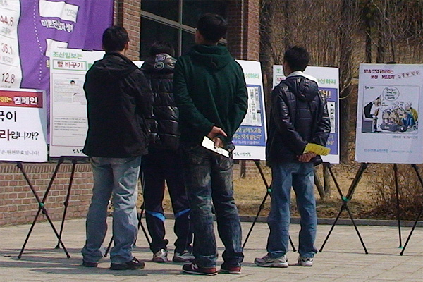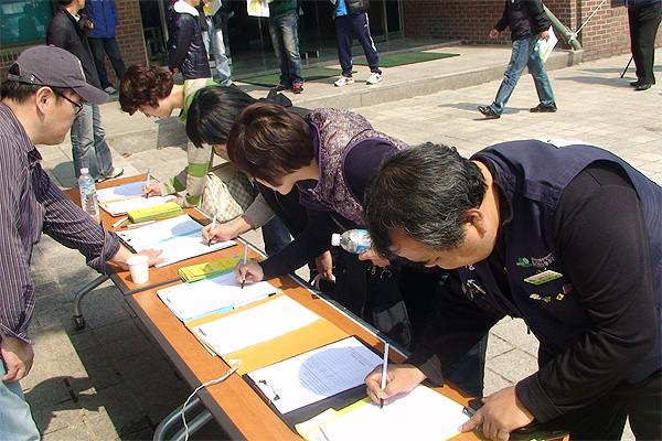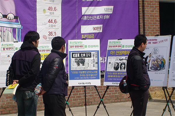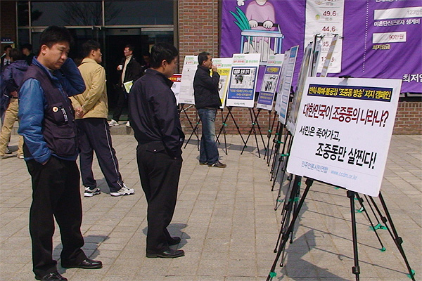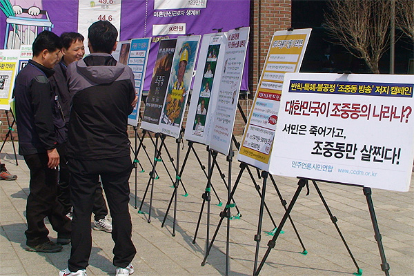 3월31일 '조중동방송 저지 네트워크'는 민주노총 전국 단위사업장 대표자 수련회가 열리는 충북 건설경영연수원에서 조중동방송 저지를 위한 판넬전시, 조중동방송 국정조사 촉구 서명운동 등 캠페인을 벌였습니다.
