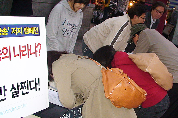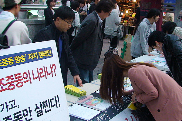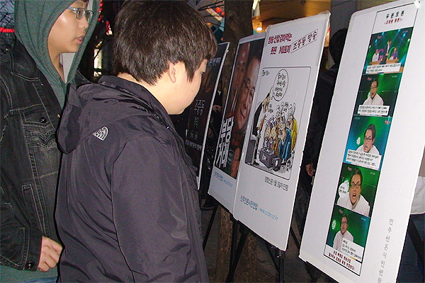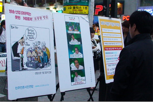 4월 8일 '조중동방송 저지 네트워크'는 홍대입구역 9번출구 앞에서 '조중동방송' 저지를 위한 판넬전시, 조중동방송 국정조사 촉구 서명운동 캠페인을 벌였습니다.