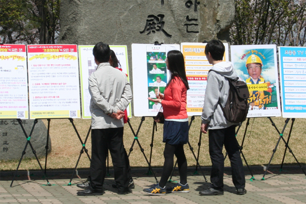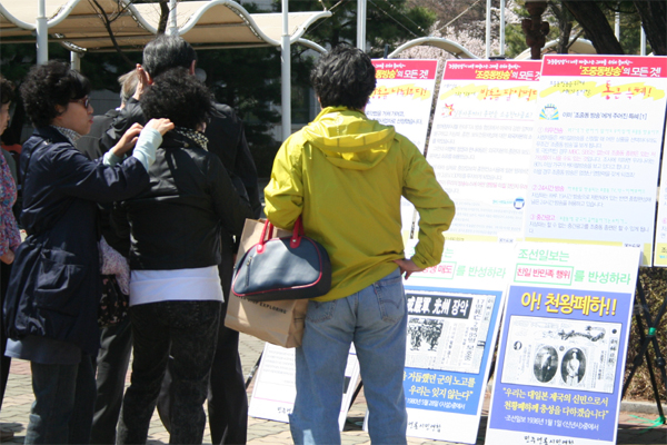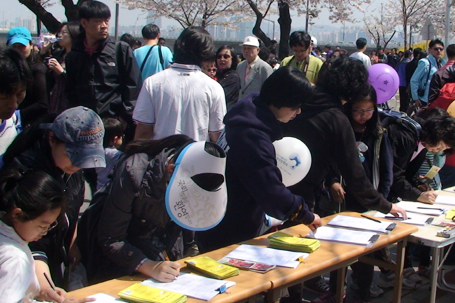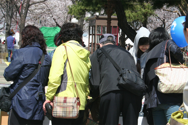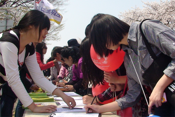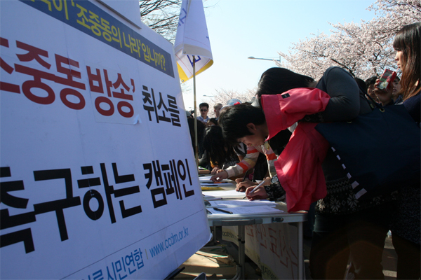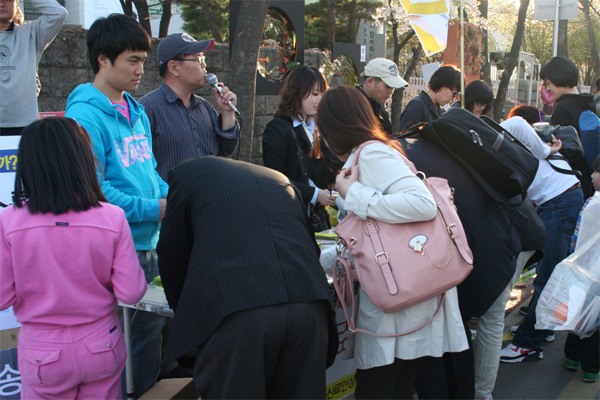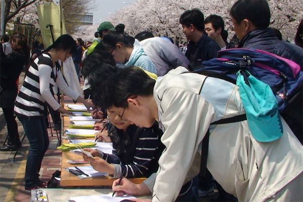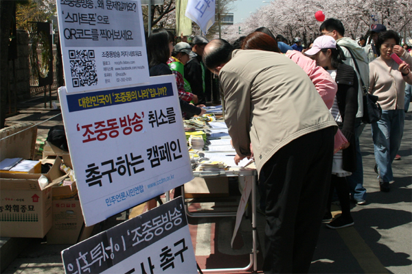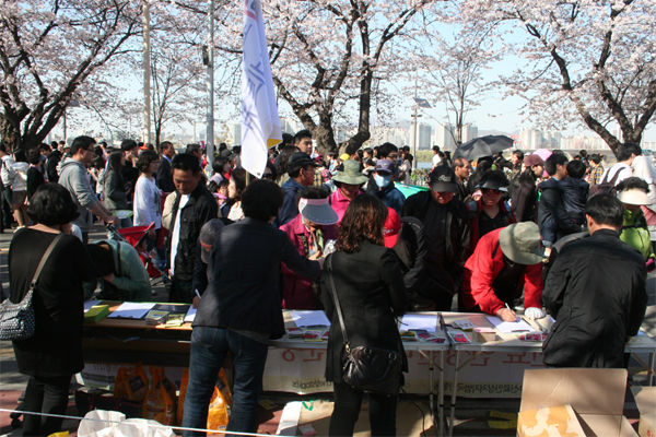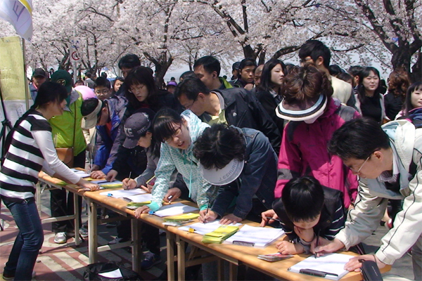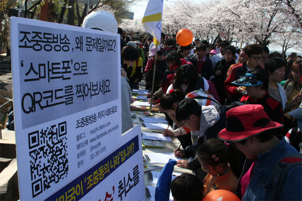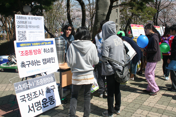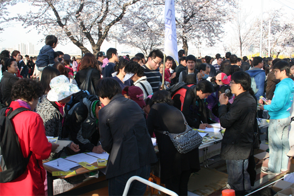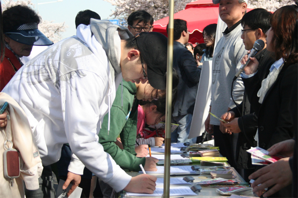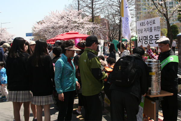 가족, 친지, 연인들과 함께 꽃구경을 나온 시민들은 4월에 한나라당이 수신료 인상안을 강행 처리할 수 있다는 소식에 '반드시 막아야 한다'며 서명운동에 동참했다.
