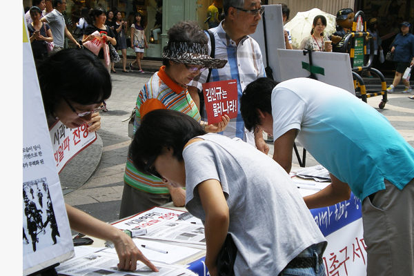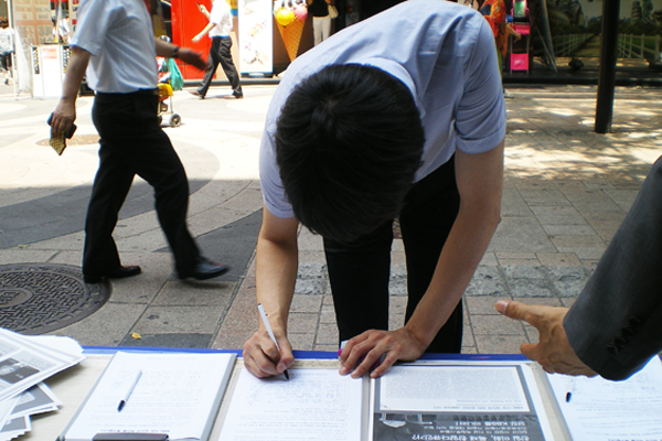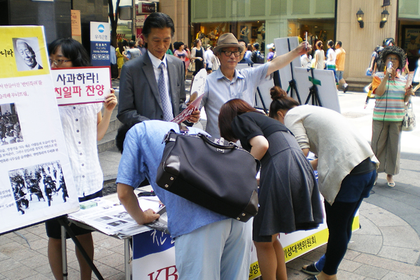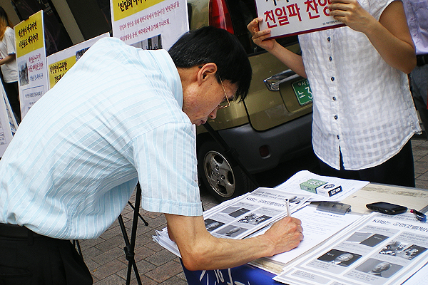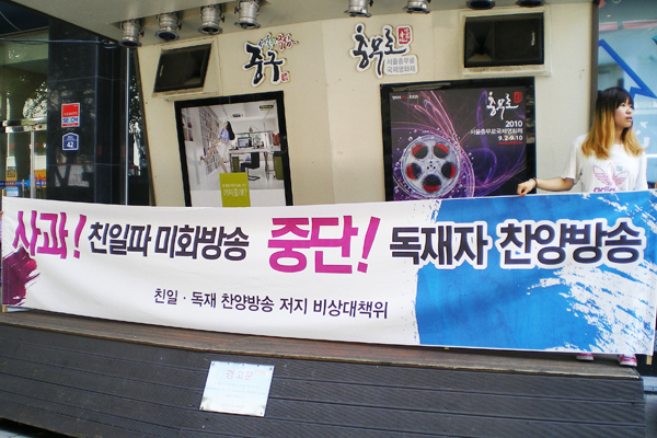 오늘(18일) 우리단체가 참여하고 있는 친일·독재 찬양방송 저지 비상대책위원회’(이하 비대위)가 명동에서 친일파 찬양’ 사과 없고 ‘독재자 찬양’ 강행하는 KBS 김인규 사장 퇴진촉구 서명 캠페인을 벌였습니다.