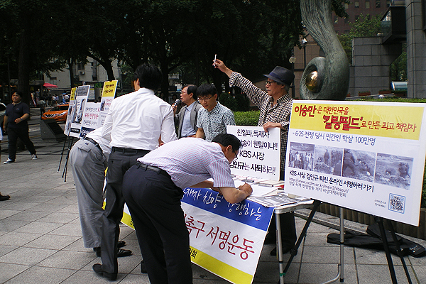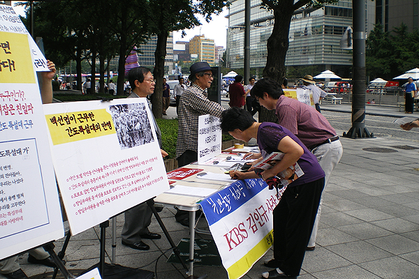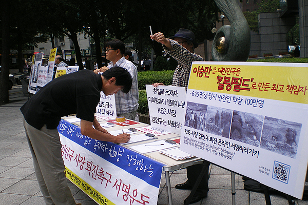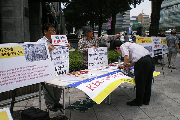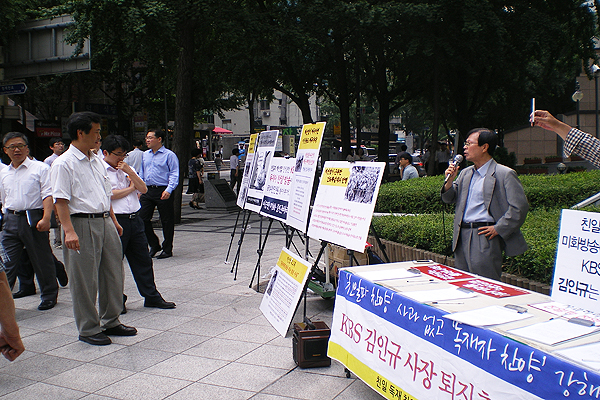 우리 단체가 속한 ‘친일ㆍ독재 찬양방송 저지 비상대책위원회’는 7월 26일(화) 서울 청계광장 인도변에서 “친일방송 사과 없이 독재자 이승만 미화방송 강행하려는 KBS 김인규 사장의 퇴진촉구 2차 거리서명”을 벌였습니다.
