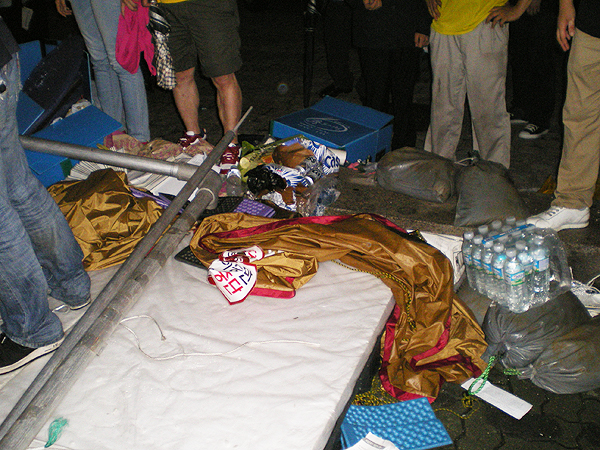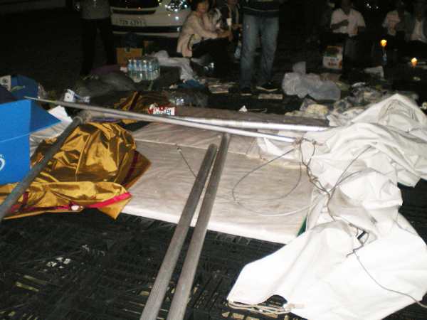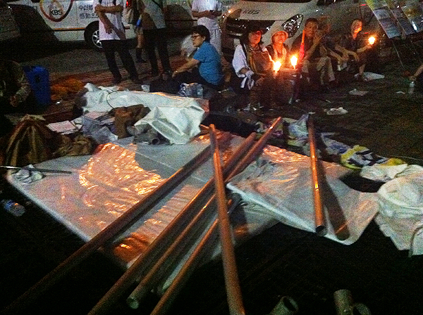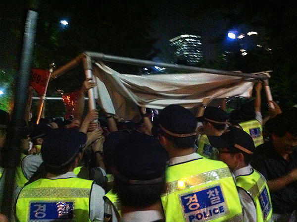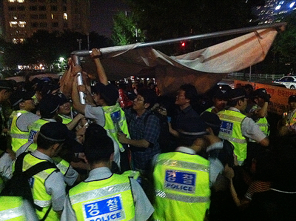집회를 마치고 밤샘농성을 벌일 예정이었으나 경찰이 투입되어 힘으로 비대위의 천막을 강제 훼손하는 일이 발생했습니다. 이 과정에서 한 분의 독립운동가 후손이 부상을 입었습니다.