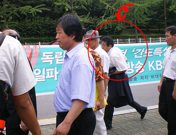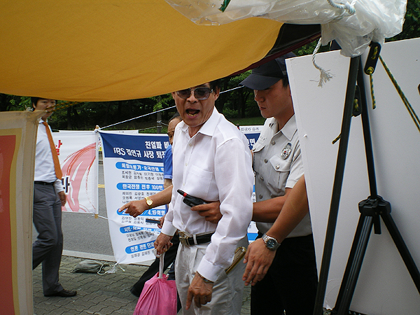 그런데 이날 오후 12시부터 '종북좌익척결단', '나라사랑실천운동', '반국가교육척결국민연합', '부산민생보호연합', '자유민주수호연합' 등 5개 단체로 구성된 보수세력 2-30여명이 농성장 옆에서 2시간가량 이승만을 비호하는 기자회견을 열고, 급기야 기자회견이 끝난 후 비대위의 농성장의 플랜카드와 판넬을 커터칼 등 흉기를 사용하여 훼손하는 일이 발생했습니다. 당시 현장에 10 여명의 경찰이 있었지만 이들의 집단행동을 제대로 제지하지 못했습니다.