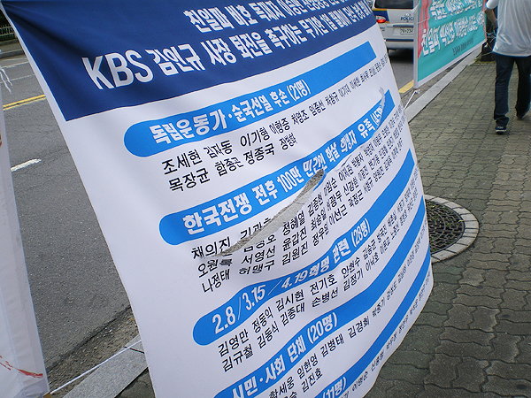 | 우리 단체가 속한 '친일독재 찬양방송 저지 비상대책위'는 KBS 본관 앞에서 10일째 단식 농성을 이어가고 있습니다. 8월 11일(목)은 <친일찬양 방송 KBS 규탄 2차 촛불집회>도 함께 열릴 예정입니다.