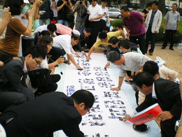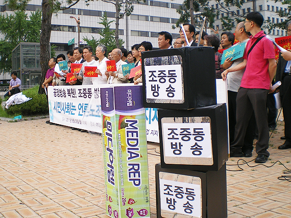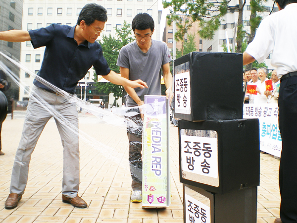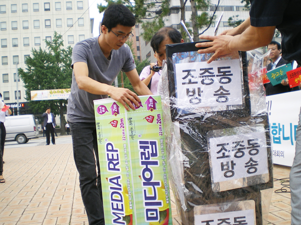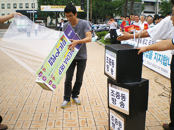 우리 단체가 속한 ‘언론노조 총파업 지지 연대회의’는 8월 29일 국회 앞에서 언론노조 총파업을 지지하는 기자회견을 열었습니다. 또한 언론노동자들의 파업에 대한 시민사회의 연대를 표시하는 퍼포먼스를 했습니다.
