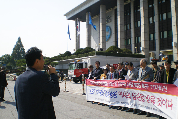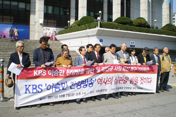 우리 단체가 속한 ‘친일ㆍ독재 찬양방송 저지 비상대책위원회’(이하 비대위)는 10월 7일 KBS본관 앞에서 KBS 이승만 찬양방송 규탄 및 김인규사장 퇴진 촉구 기자회견을 열었습니다.