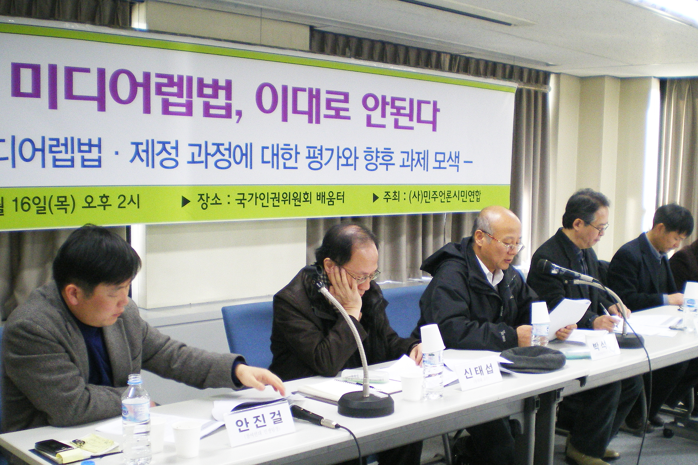 우리단체는 2월 16일(목) 오후 2시 국가인권위원회 배움터에서 <미디어렙법, 이대로 안된다>라는 주제로 토론회를 열었습니다. 지난 9일 통과된 미디어렙법과 그 제정과정에 대해 평가하고 향후 과제를 짚어보는 자리였습니다.