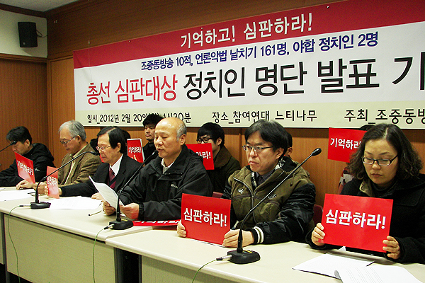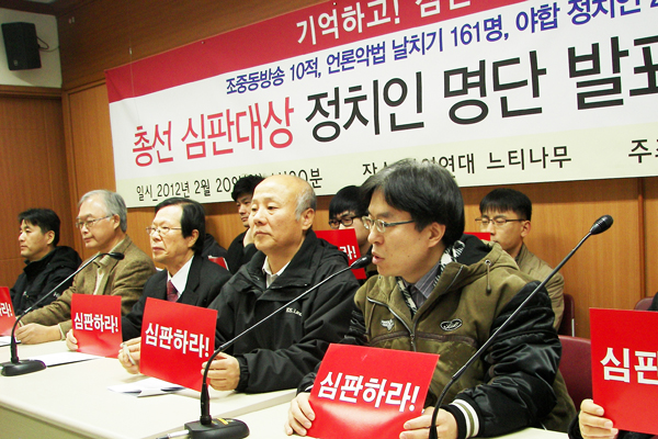 우리단체가 속한 조중동방송저지네트워크는 2월 20일(월) 오후 1시 30분 참여연대 느티나무에서 <기억하고! 심판하자! 총선 심판대상 정치인 명단 발표> 기자회견을 진행했습니다. 네트워크는 심판대상 정치인으로 조중동방송 10적, 언론악법 날치기 의원 161명, KBS수신료 인상 논의 및 미디어렙법안 야합 정치인 2명을 선정했다고 발표했습니다.