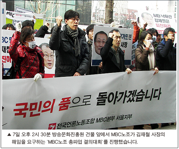 우리단체는 7일 방송문화진흥원 앞에서 열린 MBC 노조 총파업 결의대회에 참여해 MBC 노조 파업에 연대와 지지의 뜻을 전하고, 방문진에 김재철 사장의 해임을 촉구했습니다.