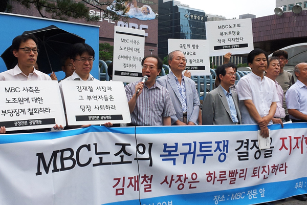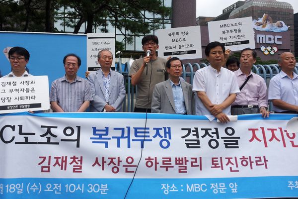 우리단체가 참여하는 <공정언론 공동행동>은 7월 18일(수) 오전 10시 30분 MBC 정문 앞에서 MBC노조의 복귀투쟁 결정을 지지하는 기자회견을 열었습니다. 공동행동은 "앞으로도 우리는 쪼인트 사장 김재철 씨가 퇴출될 때까지, 그리고 MBC가 공영방송으로 바로 설 때까지 함께 연대 투쟁해 나갈 것"이라며 "김재철 사장은 하루빨리 퇴진하라"고 외쳤습니다.