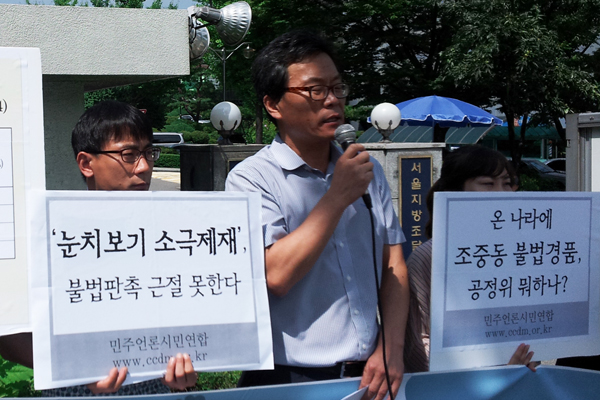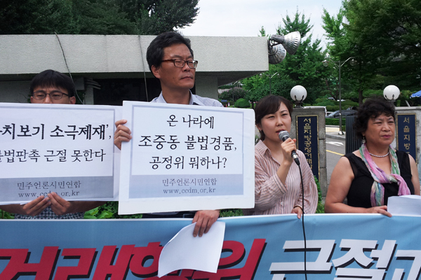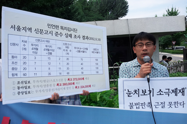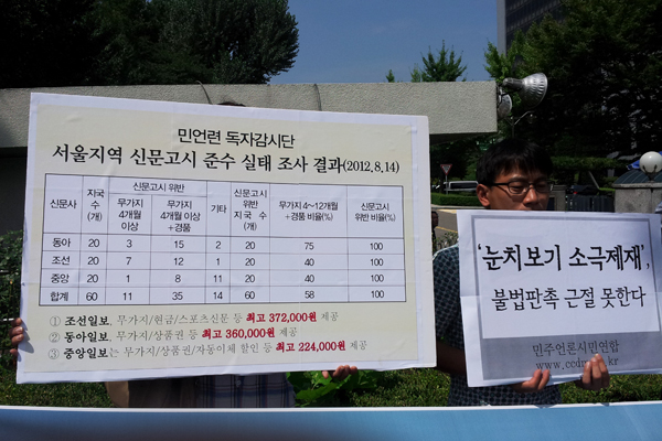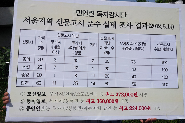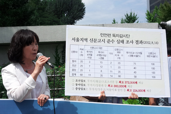우리단체와 언론노조 등은 8월 16일(목) 오전 11시 공정거래위원회 앞에서 '신문시장 불공정거래행위 근절과 공정위의 감시감독 강화를 촉구하는 기자회견'을 열었습니다. 우리단체는 기자회견에서 서울지역 조선중앙동아일보 60개 지국의 '신문고시 준수 실태 조사 결과'를 발표했습니다. 이들 지국의 신문고시 위반율은 100%에 달했습니다.