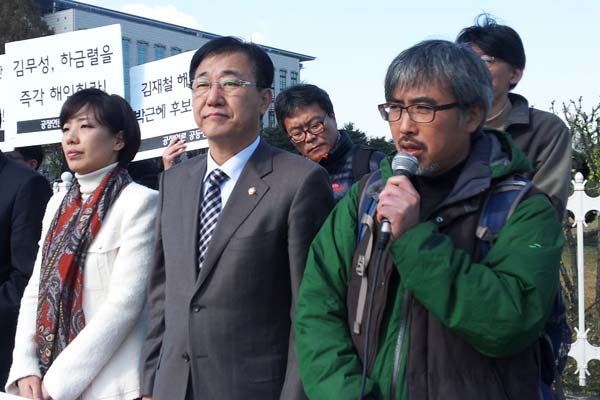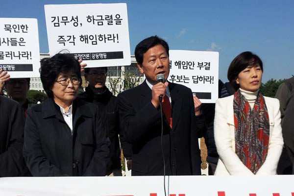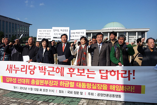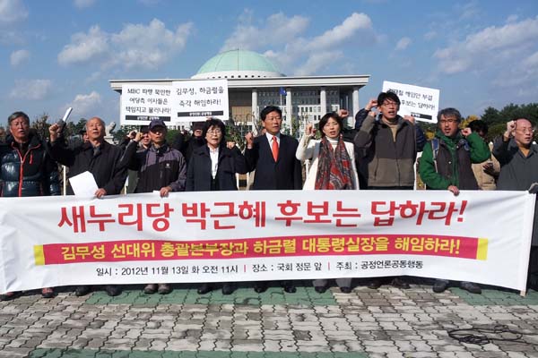 우리단체가 속한 공정언론 공동행동은 11월 13일(화) 오전 11시 국회 정문 앞에서 "새누리당 박근혜 후보는 김재철 해임부결에 대한 입장을 밝히고, 김무성 선대위총괄본부장과 청와대 하금렬 대통령실장을 해임하라!"는 기자회견을 열었습니다.