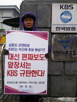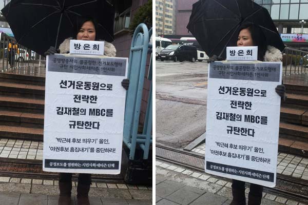 공정보도를 염원하는 시민사회·네티즌 단체의 방은희 역사정의실천연대 활동가는 12월 14일 낮 12시부터 한시간 동안 MBC 정문 앞에서 '박근혜 후보 선거운동원으로 전락한 김재철의 MBC를 규탄'하는 1인시위를 벌였습니다. 한편, KBS 신관 앞에서는 박석운 민언련 공동대표가 '대선 편파보도에 앞장서는 KBS를 규탄'하는 1인시위를 진행했습니다.