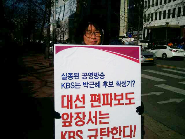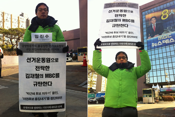 공정보도를 염원하는 시민사회·네티즌 단체의 임진수 진보정의당 대외협력팀장은 12월 18일 낮 12시부터 한시간 동안 MBC 정문 앞에서 '박근혜 후보 선거운동원으로 전락한 김재철의 MBC를 규탄'하는 1인시위를 벌였습니다. 한편, KBS 신관 앞에서는 추혜선 언론연대 사무총장이 '대선 편파보도에 앞장서는 KBS를 규탄'하는 1인시위를 진행했습니다.