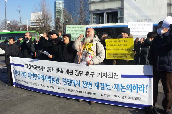 우리단체가 속해 있는 '친일·독재미화와 교과서개악을 저지하는 역사정의실천연대'는 12월 26일(수) 오후 1시 30분 대한민국역사박물관 앞에서 ‘대한민국역사박물관’ 졸속 개관 중단 촉구 기자회견에 참여했습니다.