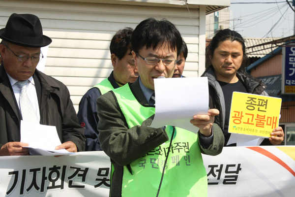 우리단체는 4월 18일 목요일 오후 2시 민주통합당 중앙당 당사 앞에서 언론소비자주권 국민캠페인과 함께 "민주통합당 종편 출연 금지 당론 폐기 규탄 기자회견"을 열었습니다. 기자회견 후에는 민주통합당에 항의서신을 전달했습니다.