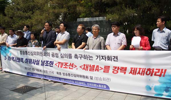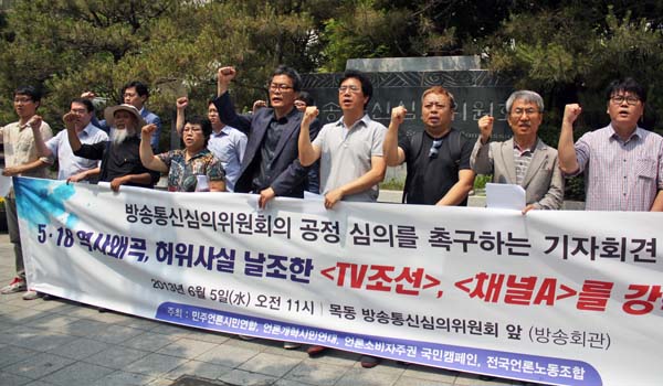 우리단체는 6월 5일(수) 오전 11시 목동 방송통신심의위원회(방송회관) 앞에서 언론개혁시민연대, 언론소비자주권 국민캠페인, 전국언론노동조합과 함께 '< TV조선>, <채널A>의 518 역사왜곡 및 허위 날조 방송에 대한 제재조치를 촉구하는 기자회견'을 열었습니다.