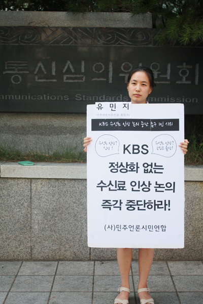 우리단체는 8월 20일(화) 오후 3시, KBS 여당측 이사들에 의해 강행된 KBS 수신료 인상 공청회가 열린 목동 방송회관 앞에서 KBS 수신료 인상 논의를 중단할 것을 촉구하는 일인시위를 진행했습니다.