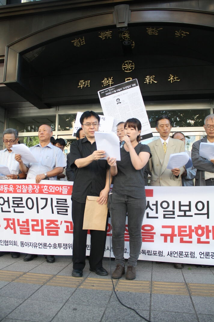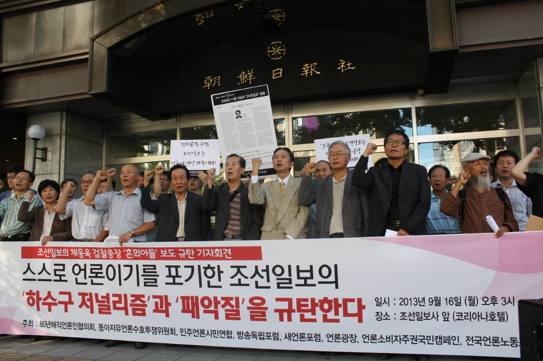 우리단체는 9월 16일(월) 오후 3시 광화문 조선일보사 앞에서 80년해직언론인협의회, 동아자유언론수호투쟁위원회, 방송독립포럼, 새언론포럼, 언론광장, 언론소비자주권국민캠페인, 전국언론노동조합과 함께 <조선일보의 채동욱 검찰총장 '혼외아들' 보도 규탄 기자회견>을 열었습니다.