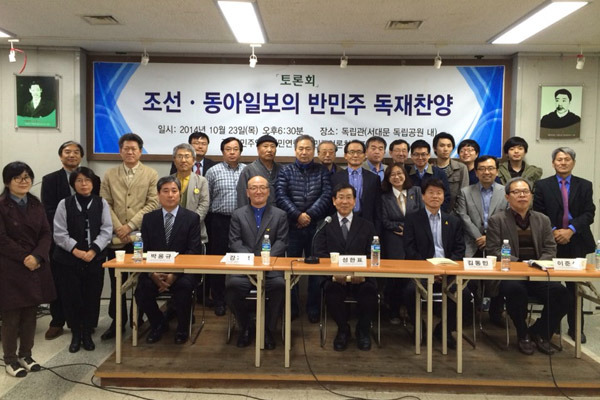 우리단체는 반민족언론청산포럼과 함께 [조선ㆍ동아일보의 반민주․독재찬양 토론회]를 10월 23일 오후 6시 30분에 서대문독립공원 내 독립관에서 개최했습니다. 성한표선생님의 사회로 김동민, 강기석 선생님이 발제를 해 주셨고 박용규, 이준석 선생님이 토론자로 나와주셨습니다.