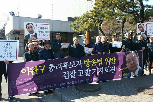 우리단체를 포함한 13개 언론시민단체는 2015년 2월 13일(금) 오후 2시 서울중앙지검 앞에서 '이완구 총리후보자 방송법 위반 관련 검찰 고발 기자회견'을 개최했습니다. 기자회견 후에는 이완구 후보자의 ‘방송법 제4조 2항(방송편성에 대한 규제나 간섭행위)위반 혐의에 대해 검찰에 고발장을 제출해 철저한 수사와 엄벌을 촉구했습니다.