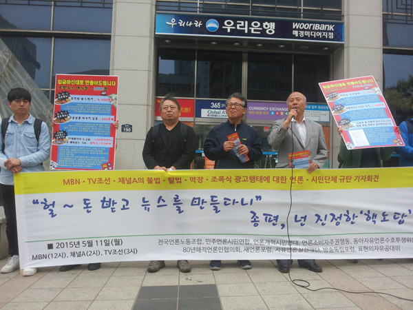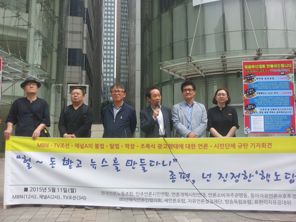 2015년 5월 11일(월) 언론시민단체들은 <'돈 받고 뉴스 파는' 종편은 문 닫아라> 기자회견을 개최했다. 이날 기자회견은 낮 12시(MBN), 오후 2시(채널A), 3시에는 TV조선 앞에서 릴레이로 진행했으며, 각 방송사 앞에서 이들의 불법적 광고영업 행태를 꼬집는 퍼포먼스도 벌였다.
