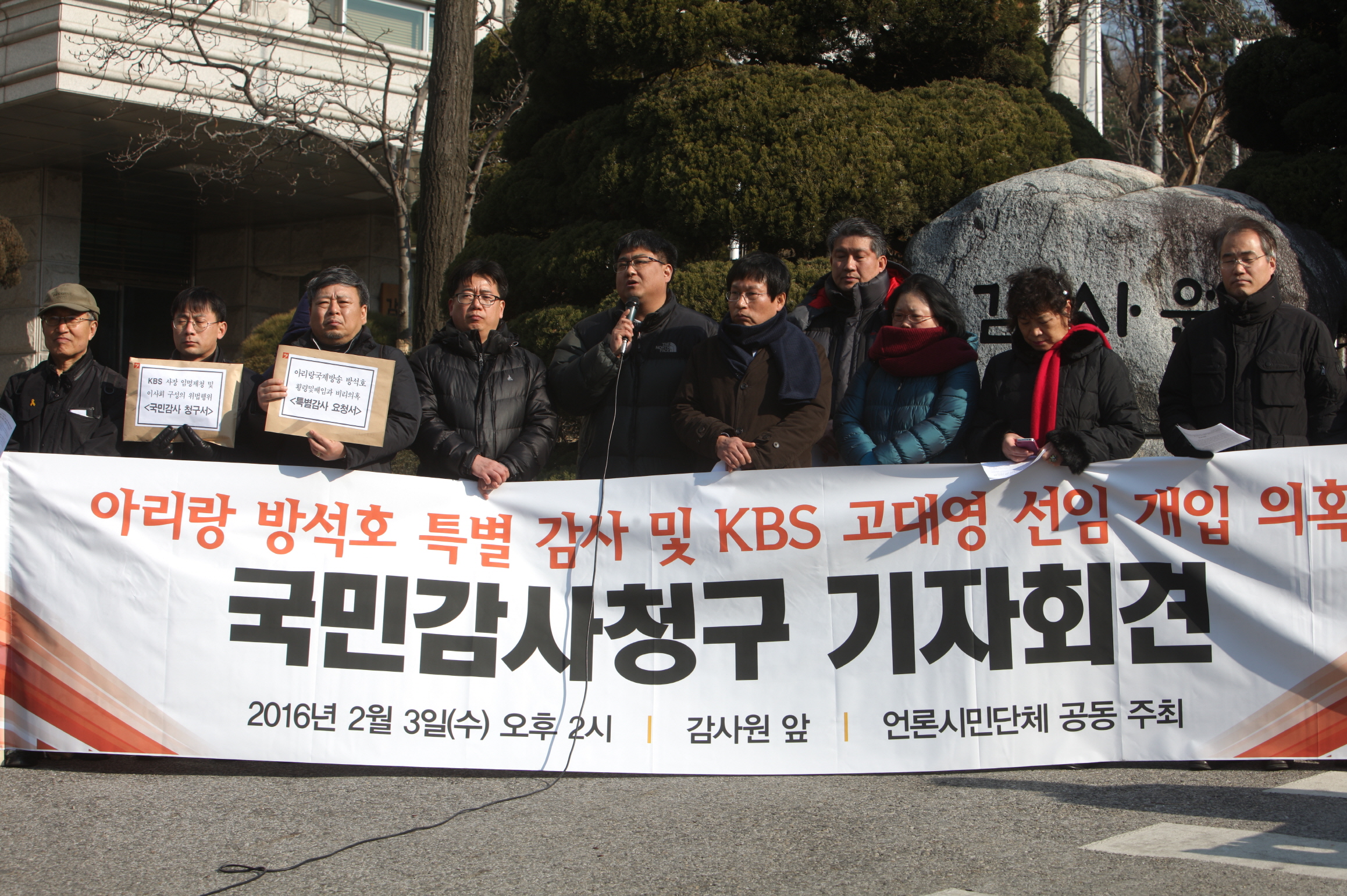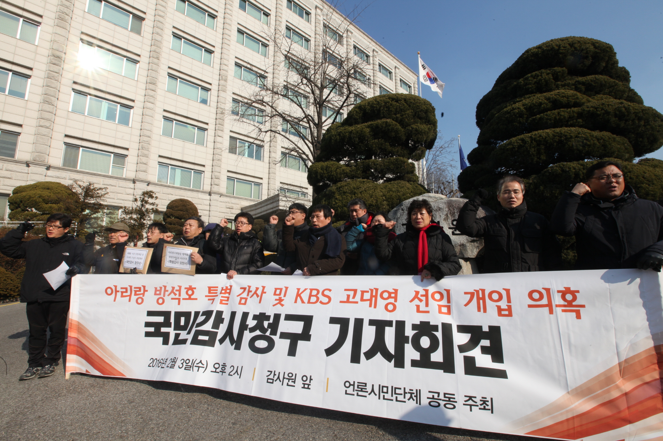 언론시민단체들은 2016년 2월 3일 오후 2시 감사원 앞에서 아리랑 방석호 특별감사 및 KBS 고대영 선임 개입 의혹에 대한 국민감사청구를 요구하는 기자회견을 개최했습니다.