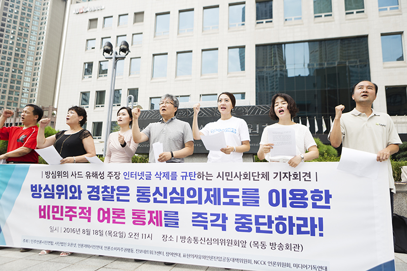 2016년 8월 16일 오전 11시, 방통심의원회원 앞에서 우리 단체와 언론개혁시민연대, 언론소비자주권행동, 오픈넷 등의 단체는 방심위의 사드 유해성 주장 인터넷글 삭제를 규탄하는 시민사회단체 기자회견을 열었습니다.