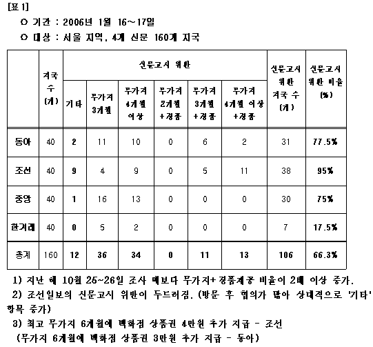 위반 내용도 더 심각해졌다. 4개월 이상 무가지 제공은 지난 해 10월 조사 때보다 무려 62%가 증가했으며, 무가지와 경품을 중복 제공하는 비율도 2배 이상 증가했다([표2]참조). 조선일보 모 지국은 무가지 6개월에 백화점 상품권 4만원 어치를 추가로 지급하는가 하면 공정위의 조사를 피하기 위해 각 가정으로 방문해 무가지와 경품 내용을 소개하는 등 음성적 수법을 사용하고 있는 것으로 조사되었다. 또한 조선일보는 무가지 4개월 제공과 경품 추가 제공 지국이 40개 조사 지국 중 11곳에 달해 다른 신문사 지국들을 압도했다. 동아일보 지국도 무가지 6개월에 백화점 상품권 3만원 어치를 제공하는 등 무가지 3~4개월에 갖가지 경품을 추가로 제공하고 있었다.
