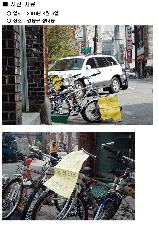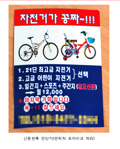 오늘(3일) 우리 회 독자감시단은 시민 제보로 강동구의 한 신문지국이 자전거를 경품으로 내걸고 판촉에 나선 현장을 포착하기도 했다. ( 사진자료 참조) 또 대단위 아파트단지를 중심으로 거대신문사 지국들의 불법 판촉이 기승을 부리고 있다는 제보도 계속되고 있다.