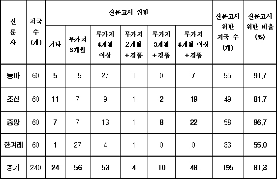 우리 단체 독자감시단이 6월 29일과 7월 3일 서울지역 4개 신문(동아, 조선, 중앙, 한겨레) 240개 지국의 신문고시 준수 실태를 조사한 결과 이들 신문의 신문고시 위반율이 평균 81.3%에 이르는 것으로 나타났다.([표1]참조)