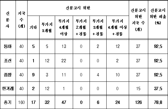 - 동아, 조선, 중앙일보 지국의 신문고시 위반율은 92.5%.