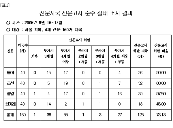 우리 단체가 8월 16∼17일 서울지역 신문지국을 대상으로 실시한 조사에서도 동아일보 지국의 90%, 조선일보 지국의 80%가 신문고시를 위반하고 있는 것으로 드러났다. ([표1] 참고)