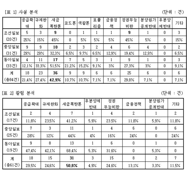 이들 신문들의 사설과 칼럼을 모두 합쳐 통계를 냈을 때 ‘세금폭탄론’을 담고 있는 사설이 42.9%를 차지했고, 칼럼은 50.8%로 나타났다. 부동산관련 사설과 칼럼 중에서 거의 절반이 ‘세금폭탄론’을 주장한 셈이다.