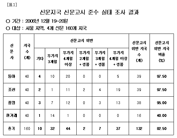 지난 12월 19-20일 우리 단체 독자감시단이 서울지역 주요 신문 지국(동아, 조선, 중앙, 한겨레 신문) 160곳을 대상으로 신문고시 준수 실태를 조사한 결과 한겨레를 제외한 조선·중앙·동아일보 지국들의 90% 이상이 신문고시를 위반하고 있었다. 뿐만 아니라 이들 신문지국들은 대부분 4개월 이상의 무가지를 제공하거나 무가지와 경품을 함께 제공해 신문고시 위반의 정도가 심각했다. ([표1] 참고)
