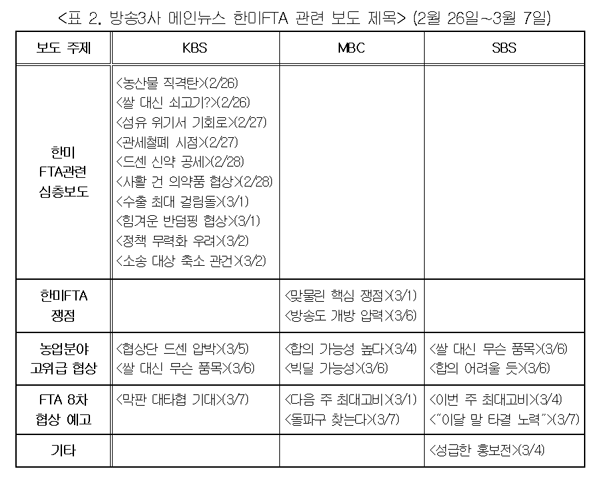 그러나 이번에도 KBS 이외에는 한미 FTA관련 보도량 자체가 매우 적었으며, 대부분의 보도가 10번째 이후 꼭지로 다뤄졌다. 또 KBS가 2월 26일부터 3월 2일까지 5일간 연속기획 <한미FTA어디까지>를 내보낸 것 외에는 지금까지의 협상 내용을 자세히 분석한 심층보도를 찾기 어려웠다.