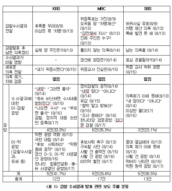 검찰 수사결과 발표 후 공방보도가 KBS 75%, MBC 64.7%, SBS 61.5%로 나타났다. 이명박, 박근혜 후보 측의 공방이 KBS 33.3%(4건), MBC 35.3%(6건), SBS 23.1%(3건)나 되었고, 이명박 후보 측이 정치공작이라며 검찰을 공격하고 이에 검찰이 대응한 보도를 ‘공방’ 형식으로 다룬 보도도 MBC가 29.4%(5건), KBS 41.7%(5건), SBS 38.5%(3건)이었다.<표1>