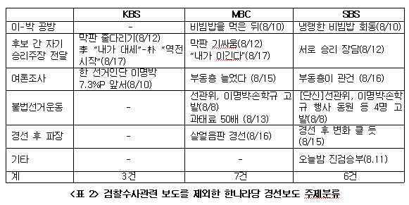 검찰 수사 관련 보도 외에 한나라당 경선 보도는 MBC가 7건으로 가장 많았고, SBS 6건, KBS가 3건의 보도를 내보냈다. 후보들이 자기 승리를 장담한 발언을 전달한 보도와 여론조사 보도가 3사 모두 있었고, KBS만 불법선거운동과 경선 후 파장을 다루지 않았다.<표2>