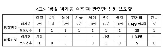 그러나 한겨레를 제외한 신문들은 김 변호사의 주장과 삼성의 ‘반박’을 ‘공방’내지 ‘논란’ 수준으로 각 1건씩만 보도하는데 그쳐 사건의 진실을 파헤치려는 심층적인 노력을 전혀 보이지 않았다. 그저 편집상 기사 배치나 기사 길이에 있어 약간의 차이를 드러낼 뿐이었다.(<표1>참고)