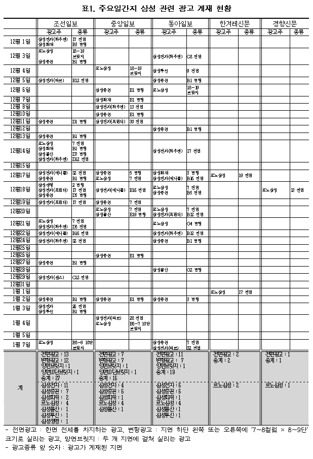 삼성전자, 삼성증권, 삼성화재, 삼성물산, 삼성투신, 삼성생명 등 삼성의 주요계열사들은 조선·중앙·동아에 골고루 광고를 집행했지만, 한겨레와 경향에는 단 한 건도 실리지 않았다. 특히 삼성전자는 조선 11건, 동아 6건, 중앙 4건 등 냉장고, 세탁기, 프린터, 노트북, 핸드폰, TV 등 주요 가전브랜드 광고를 조·중·동에 보란 듯이 넉넉하게 집행하면서도 한겨레와 경향에는 단 한 건도 광고를 내지 않았다.