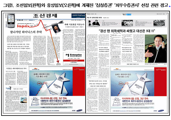 또 삼성증권은 홍콩 경제지 ‘아시아머니’가 자사를 ‘3년 연속 대한민국 최우수 증권사’로 선정했다는 광고를 조선(12월 17일), 동아(12월 18일), 중앙(12월 19일)에 번갈아가며 게재했지만, 한겨레와 경향에는 싣지 않았다.